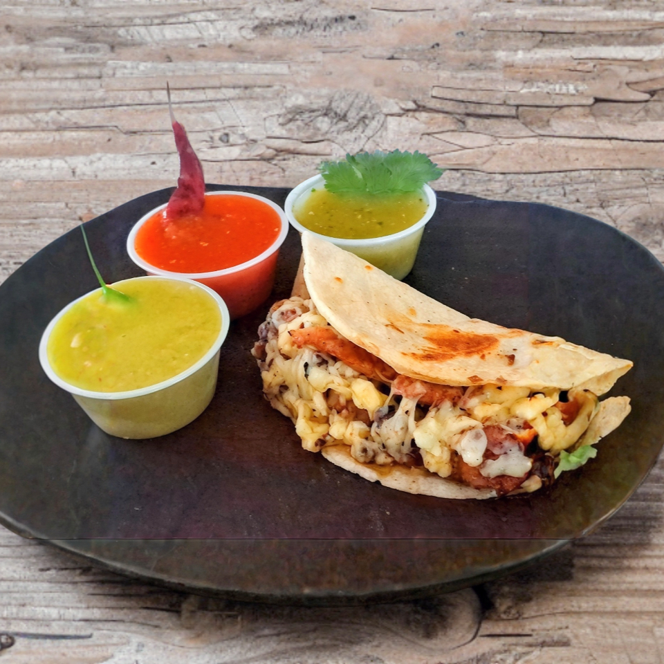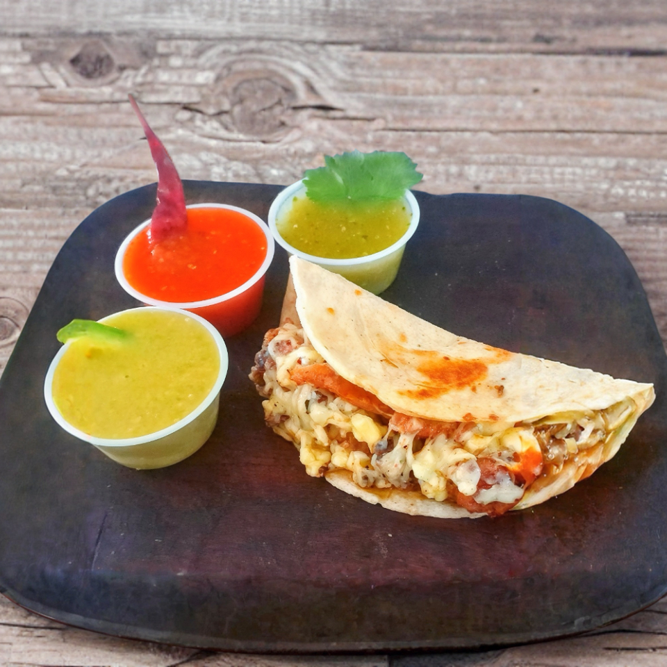 Una tortilla de Harina rellena de Carne Asada y queso para derretir, acompañada de salsas y pico de gallo aparte .
