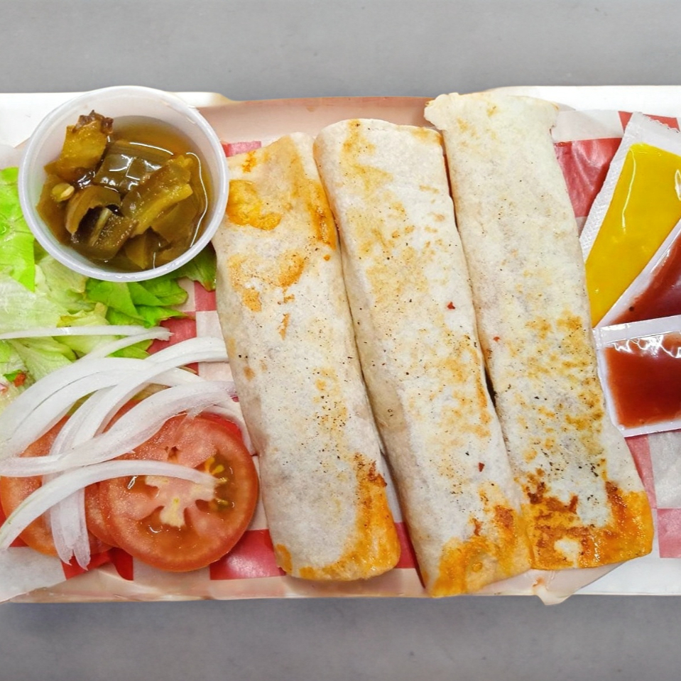 Tortilla de harina con frijoles y carne de barbacoa. Acompañado de lechuga, jitomate, cebolla, catsup, moztaza (3 pzs)