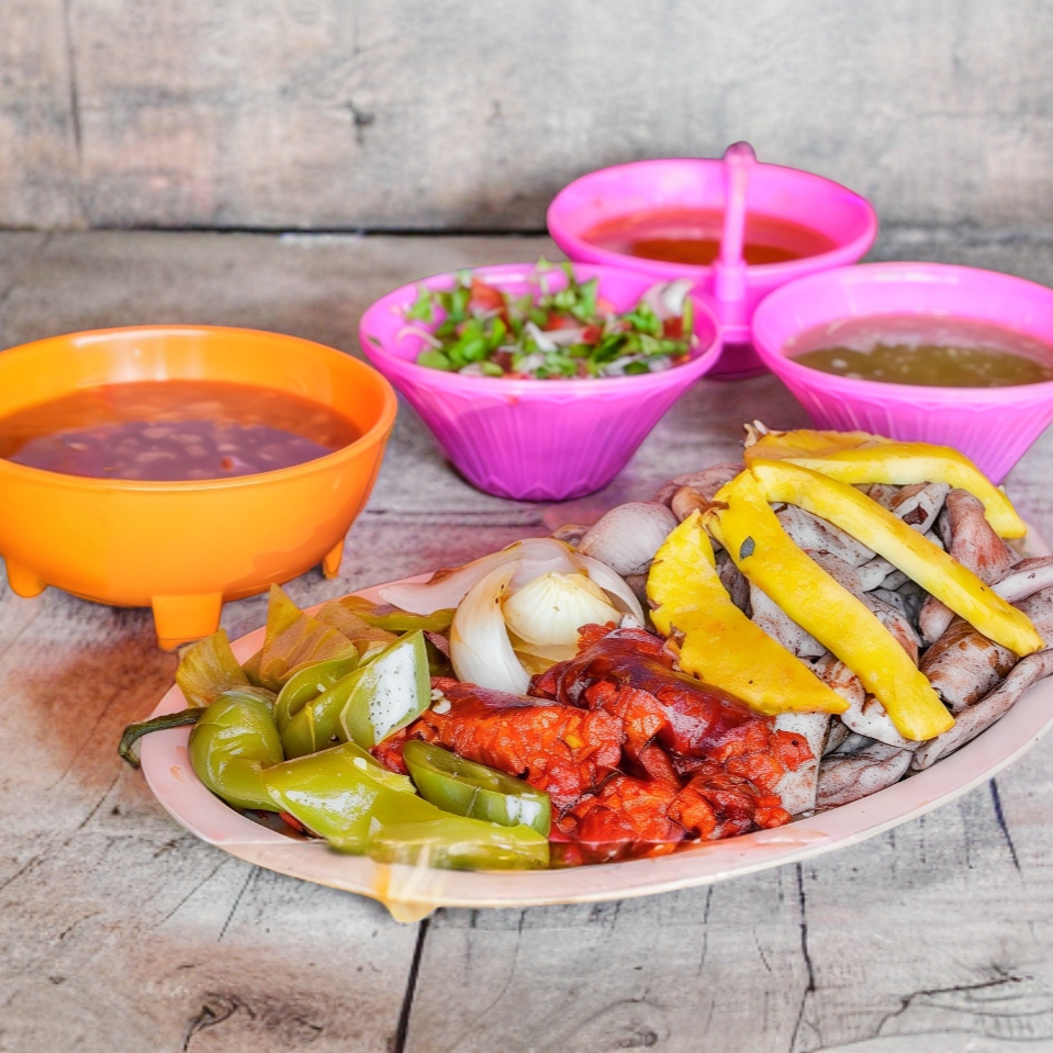 Para Compartir Incluye: DELICIOSA CARNE Y CHORIZO ASADO, ACOMPAÑADO CON CEBOLLA, NOPALES Y PIÑA GUISADAS, CHILES TOREADOS, TORTILLAS Y SALSAS
