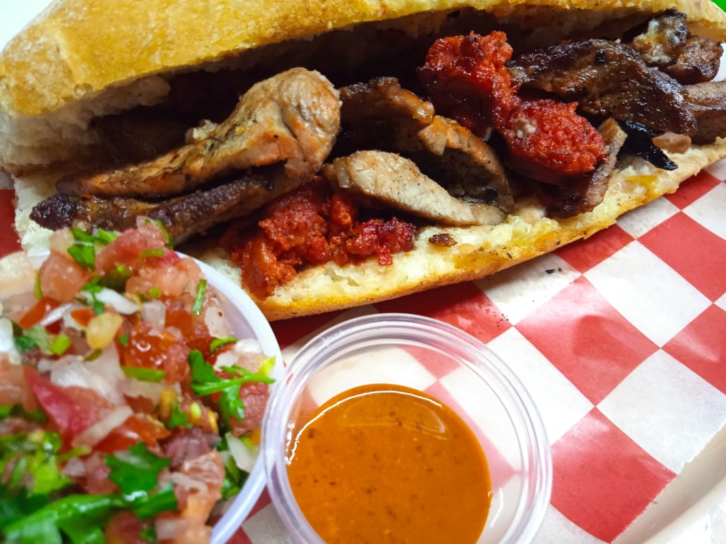 DELICIOSOS LONCHES DE CARNE Y CHORIZO ASADA CON FRIJOLES FRITOS. ACOMPAÑADOS DE SALSAS
