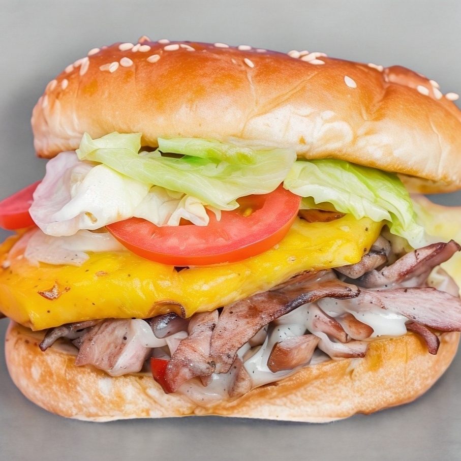 Deliciosa Hamburguesa de Carne Asada y Chorizo con exquisito queso gratinado a la plancha. Acompañado de Lechuga, jitomate, cebolla y piña. con catsup, mostaza y chile jalapeño aparte.