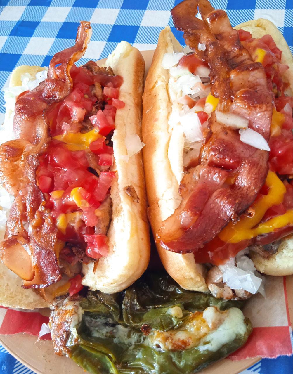LLEGO EL HOT DOG AL ESTILO ASADERO. DENTRO DEL PAN PARA HOT DOG LLEVA CARNE ASADA CON CHORIZO CON QUESO GRATINADO A LA PLANCHA TOCINO EXQUISITAMENTE DORADO. ACOMPAÑADO DE JITOMATE, CEBOLLA, CATSUP, MOSTAZA Y JALAPEÑO APARTE