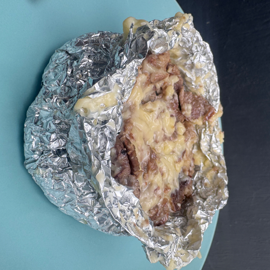 Papa envuelta en aluminio con queso y rellena de arrachera cocinada a las brasas