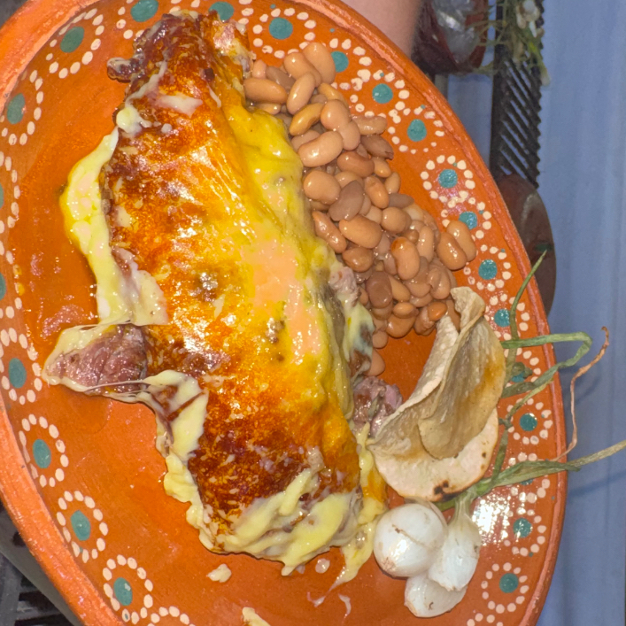 Rica costra de queso rellena de costilla a las brasas, con frijoles y tortillas