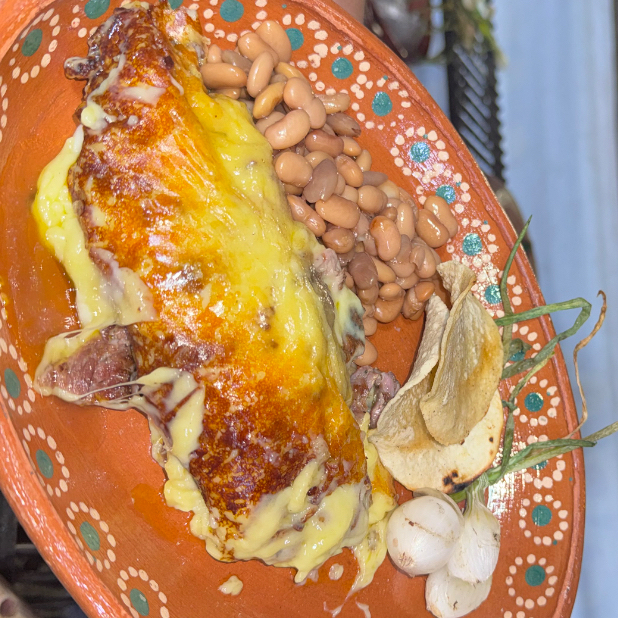 Rica costra de queso rellena de arrachera a las brasas, con frijoles y tortillas