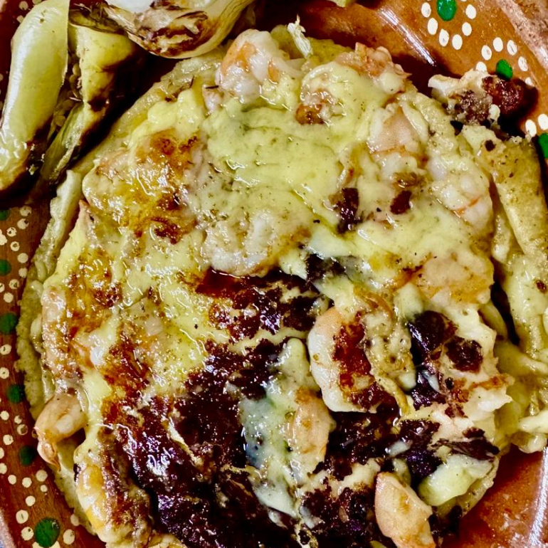 Sope jumbo recién hecho con un toque de mantequilla, rellena con camarones a la mantequilla y una costra de queso