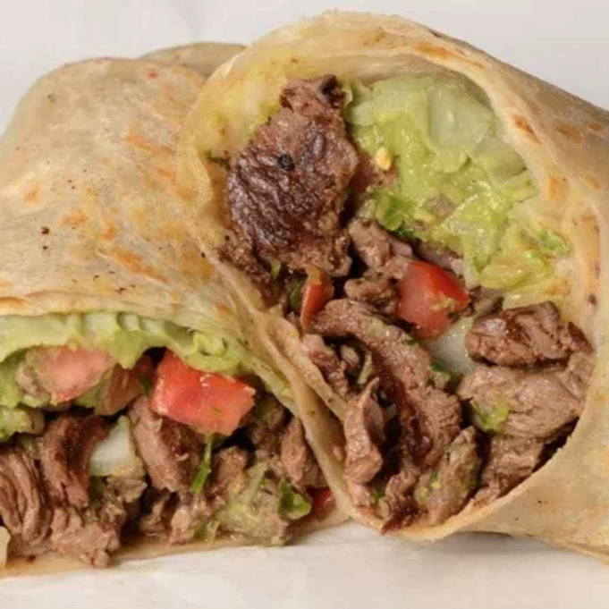 Burrito con tortilla de harina grande con queso, aguacate y arrachera a las brasas, cocinado con un toque de mantequilla
