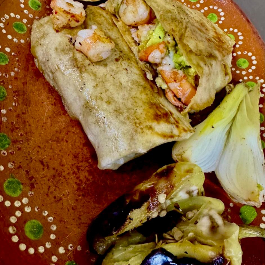 Burrito con tortilla de harina grande con queso, aguacate y camarones a la mantequilla, cocinado con un toque de mantequilla, partido por mitad