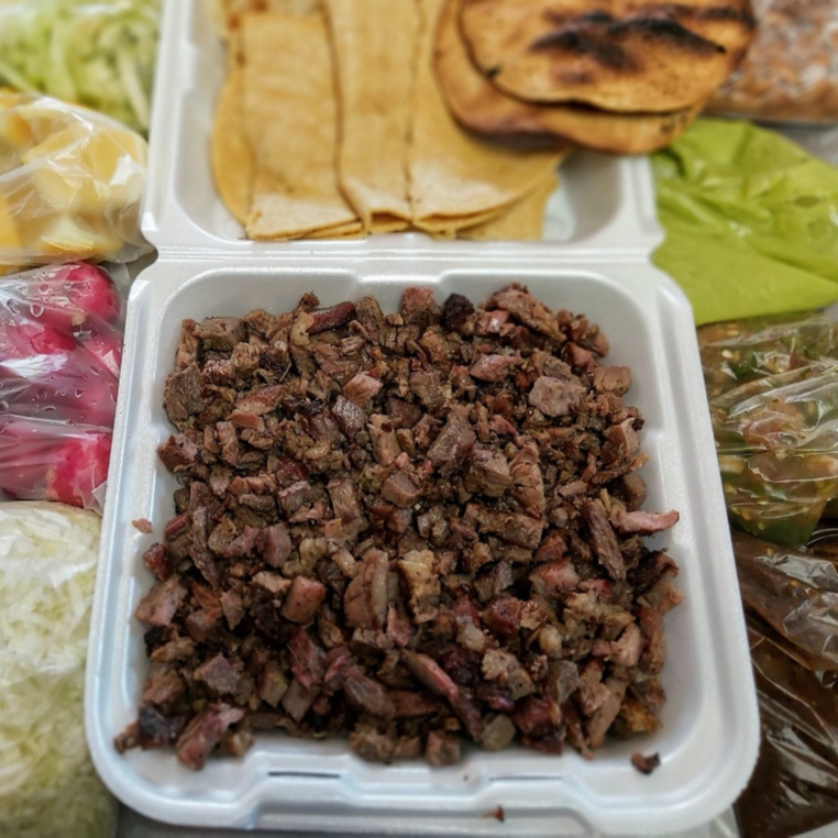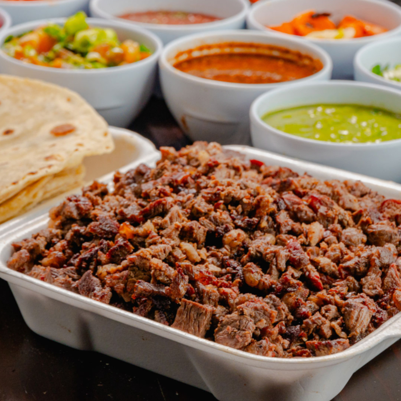 Orden de diezmillo para compartir para dos personas, acompañado con tortillas de maíz, salsas y frijoles refritos.