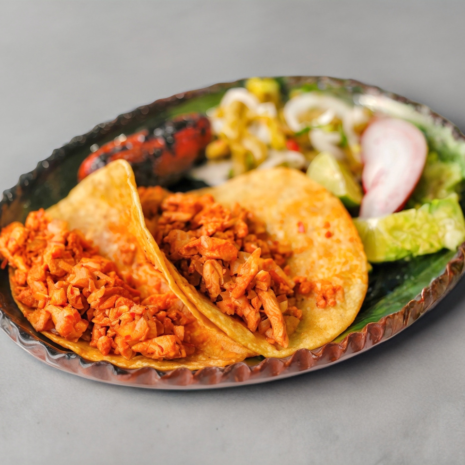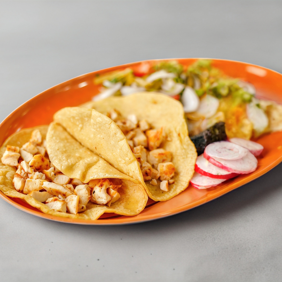 Delicioso taco con pechuga de pollo marinada, a la plancha, con tortilla de maíz recién hecha, tamaño normal.