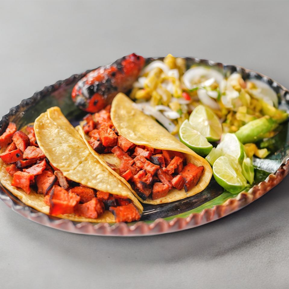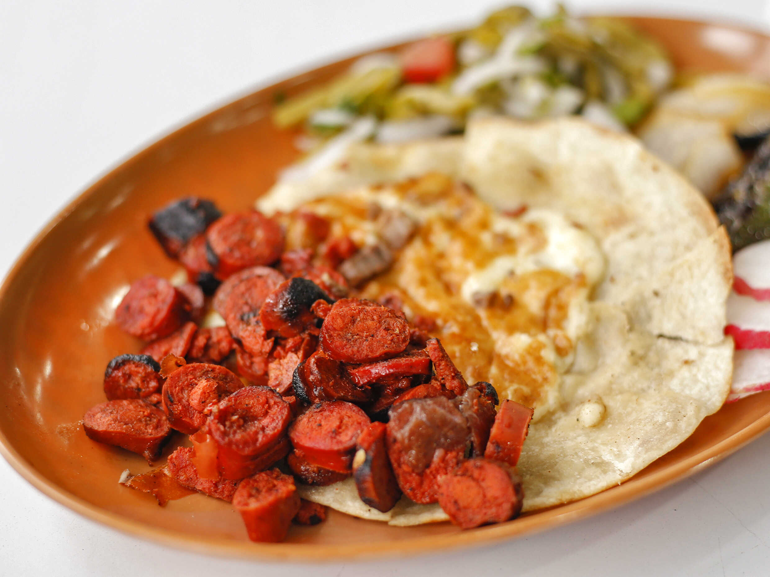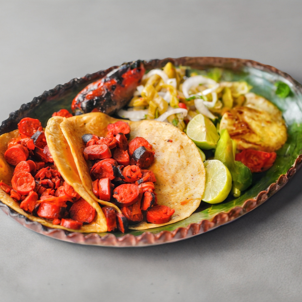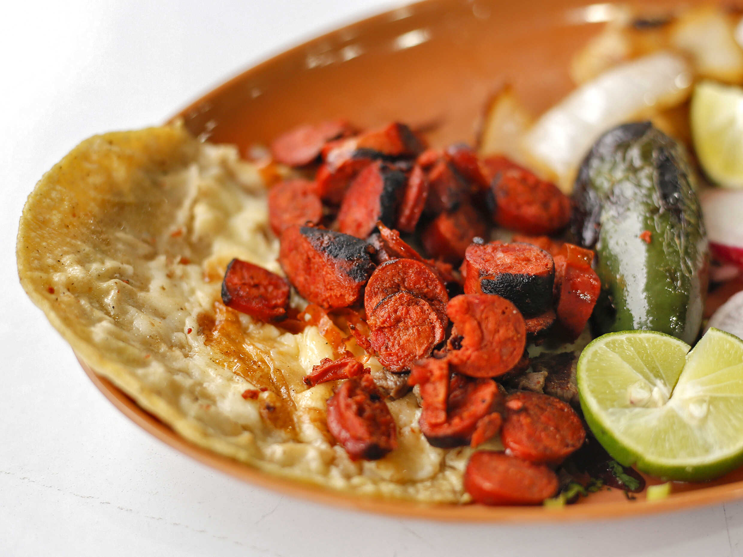 Delicioso taco de chistorra marinada al carbón, con tortilla de maíz recién hecha, tamaño normal.