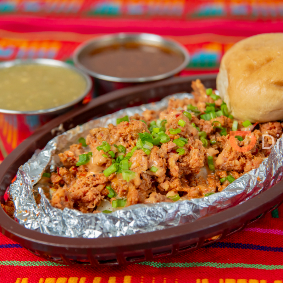 trozos de asada y chorizo con queso fundido y chipotle panecillo y salsas