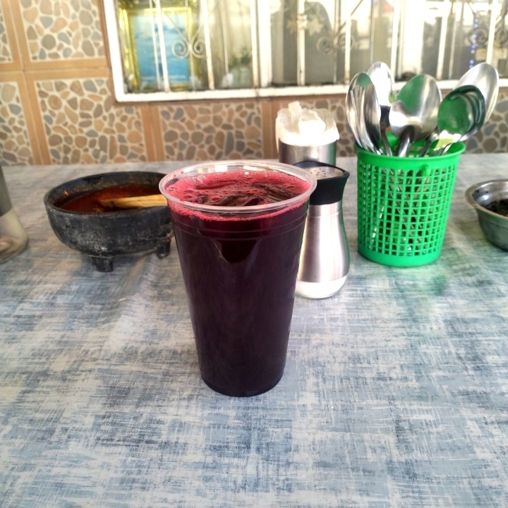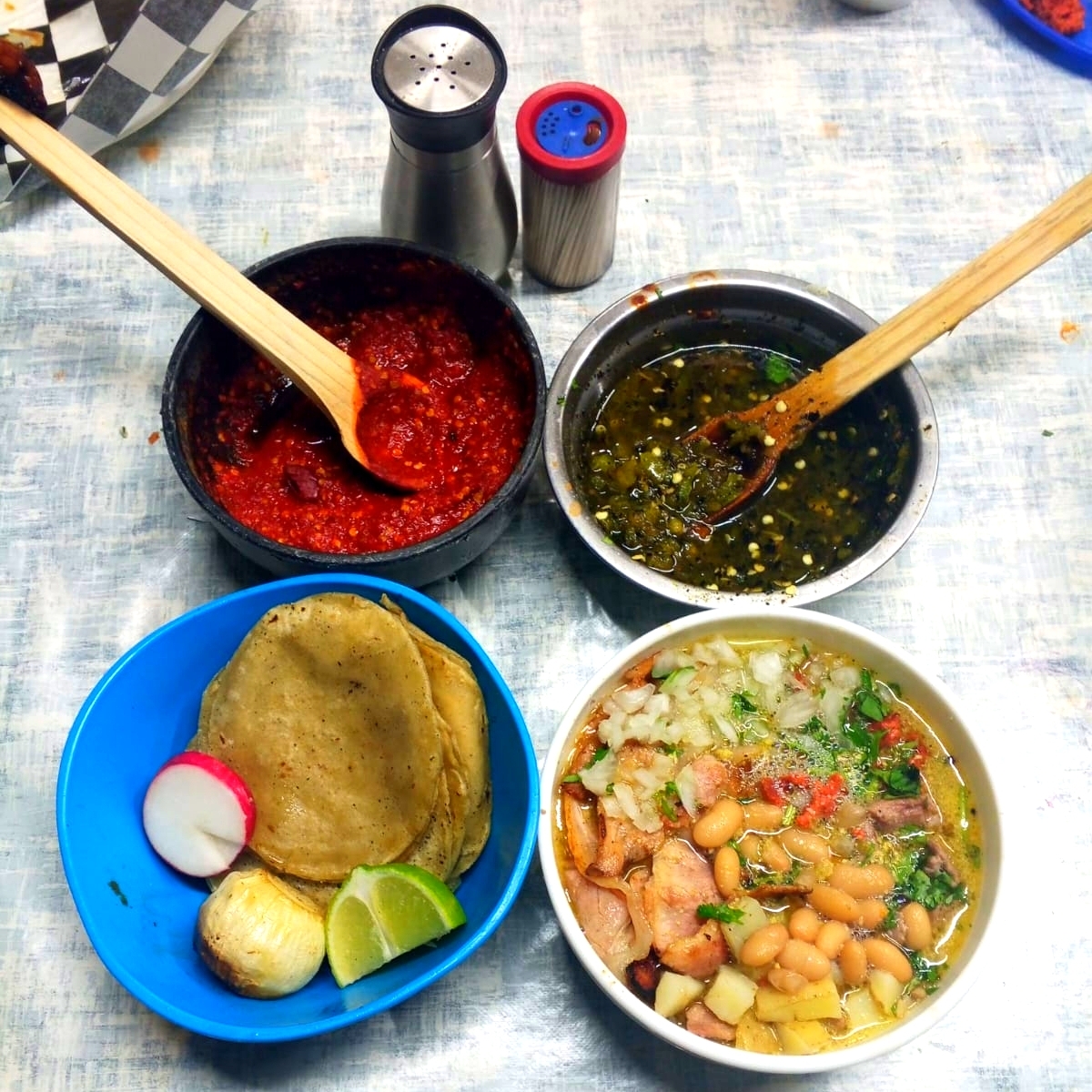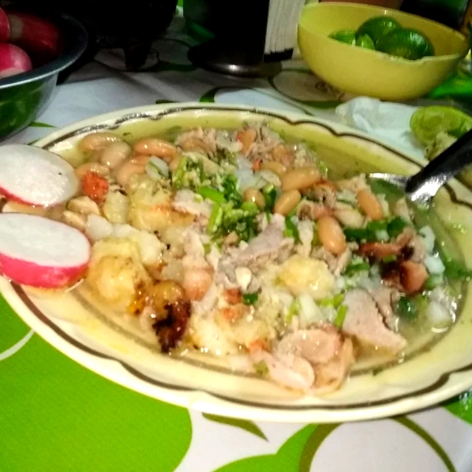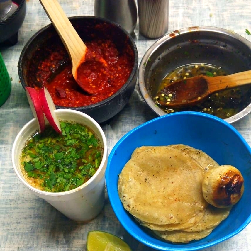 1 litro de carne en su jugo acompañada de frijoles de la olla recién cosidos y papas , incluye tortilla y cebolla asada , y chile de su preferencia.
