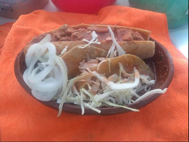 Taco dorado de papa con buche, acompañados de col, salsa de jitomate y salsa picante