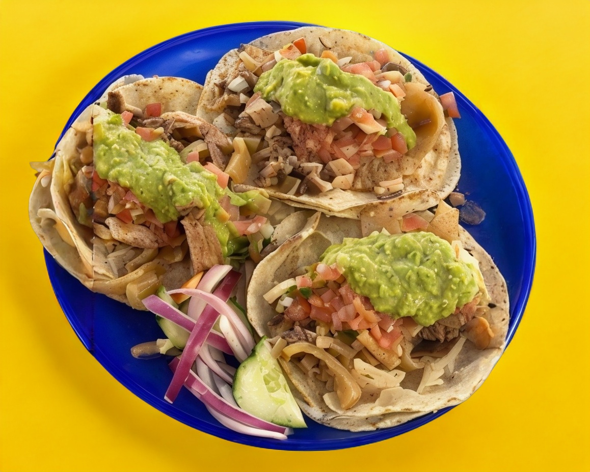 taco combiando de carne con cuero , acompañado de salsas y verduras