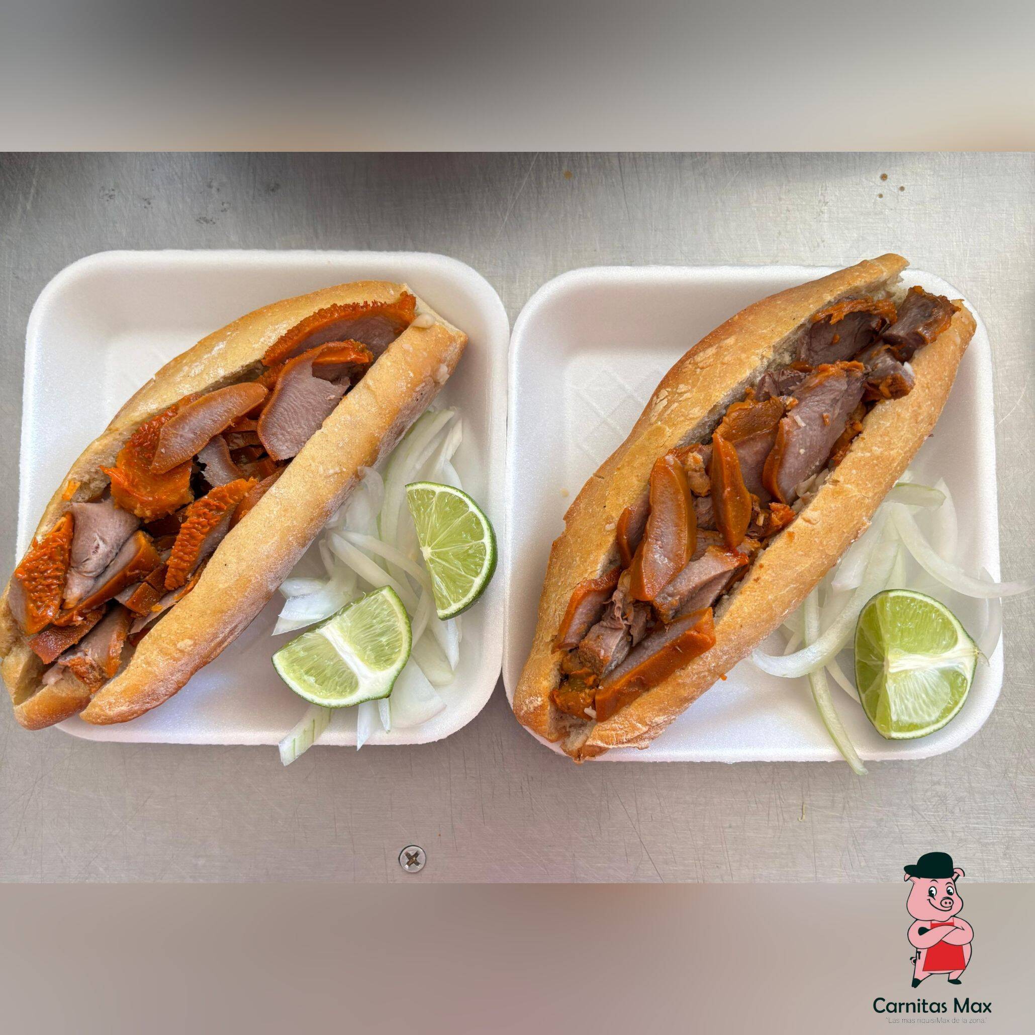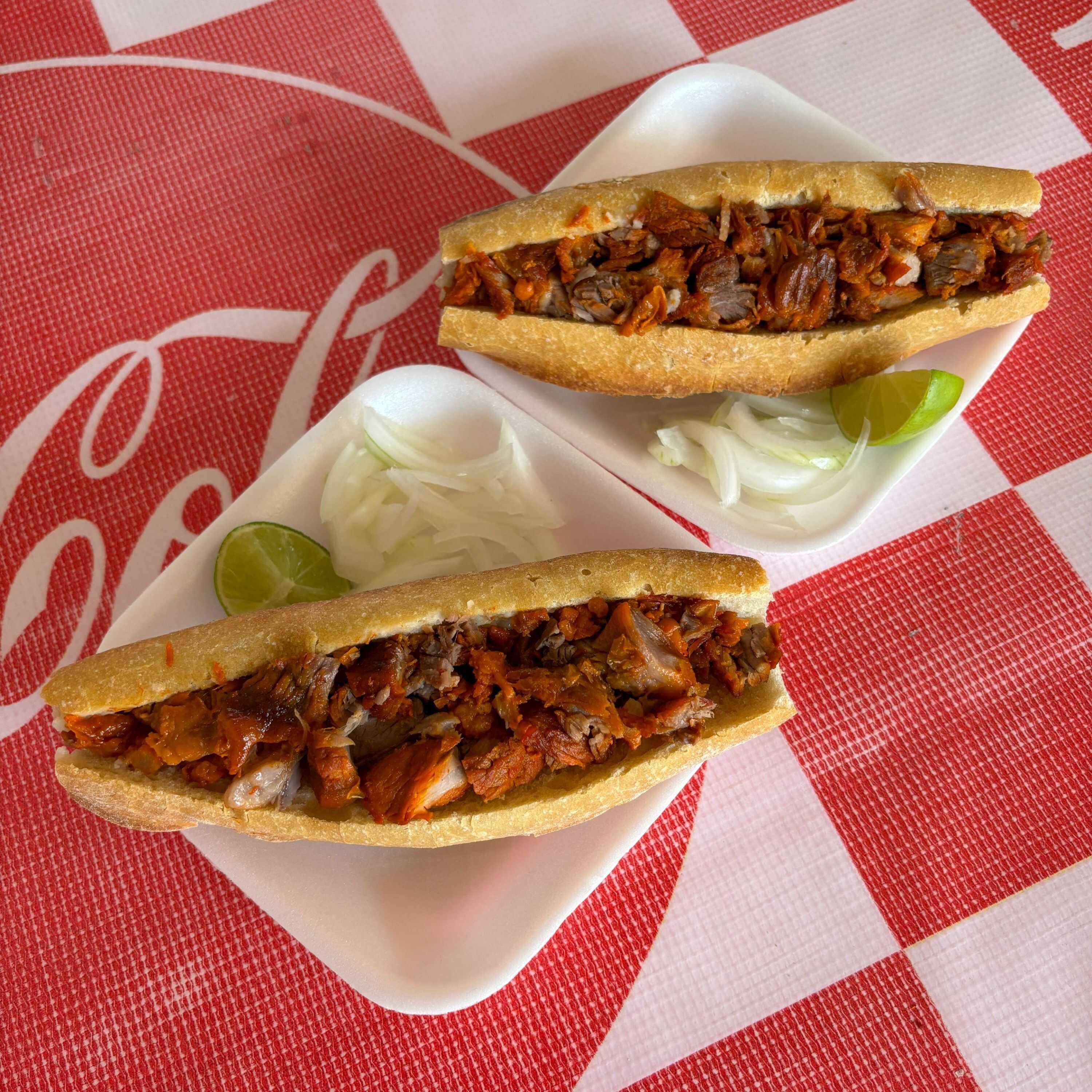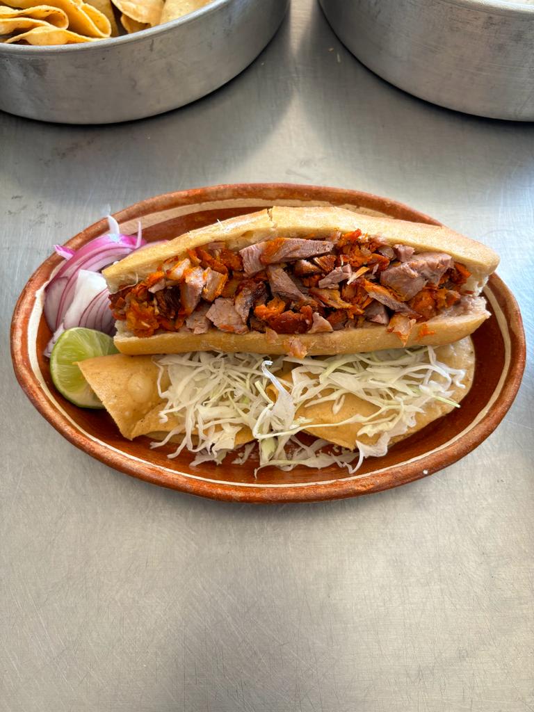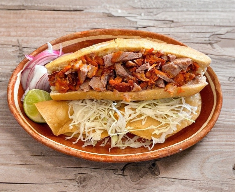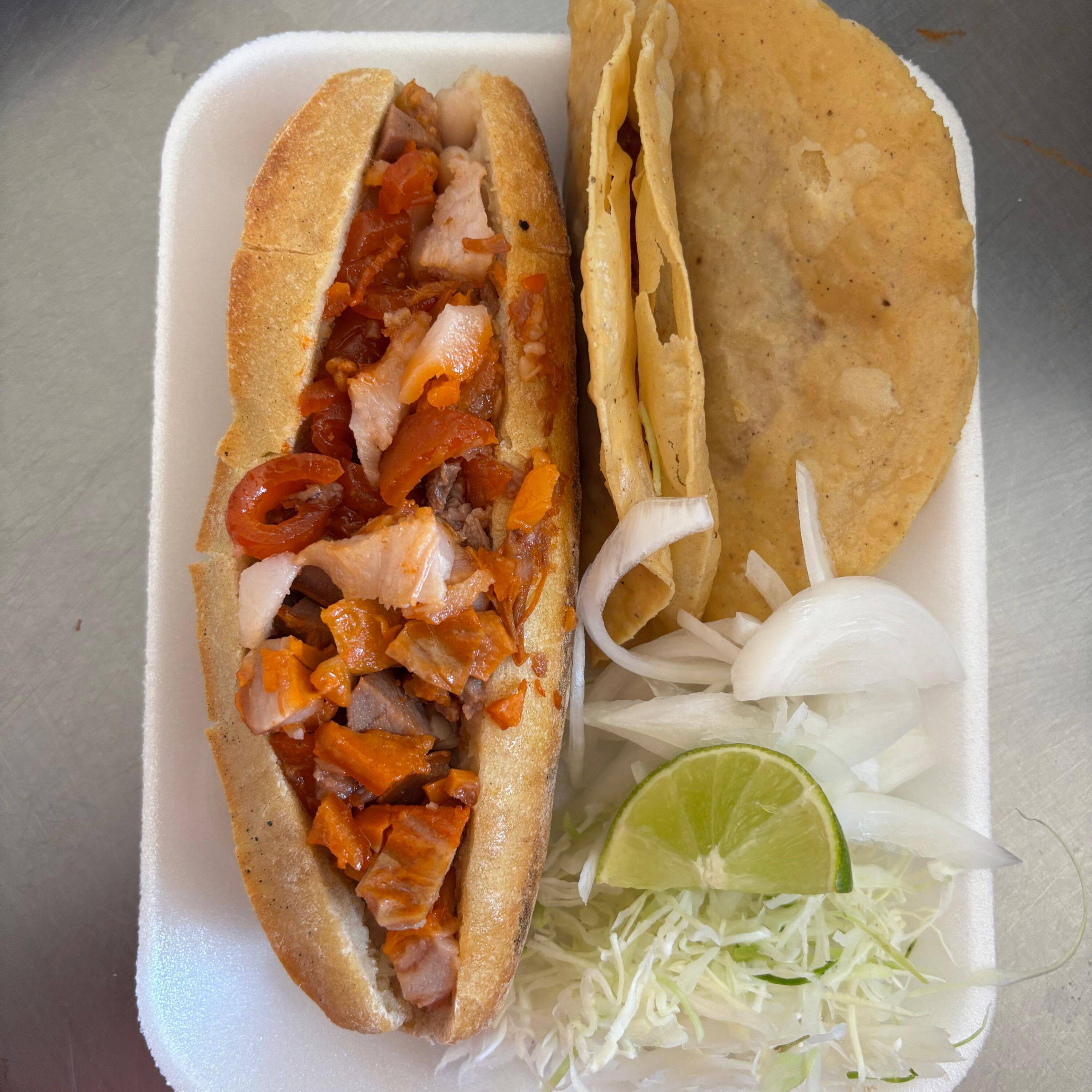 Torta ahogada de maciza (carnitas). Incluye salsa de jitomate, chile de árbol, cebolla, limón.