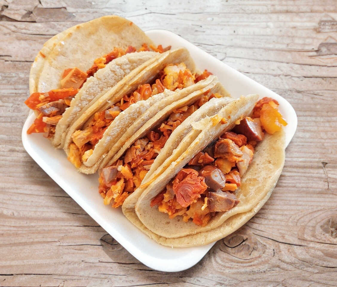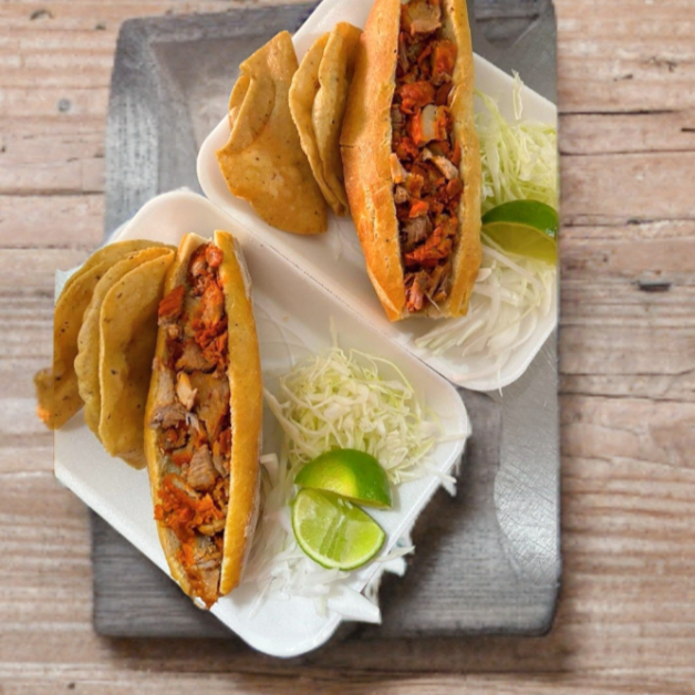 Con tortilla doble recién hecha. Incluye salsa mexicana, salsa picante, limón.