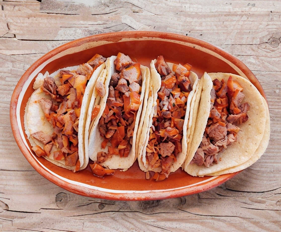 4 tacos de carnitas. Con tortilla recién hecha, acompañado de salsa mexicana, salsa picante y limón
