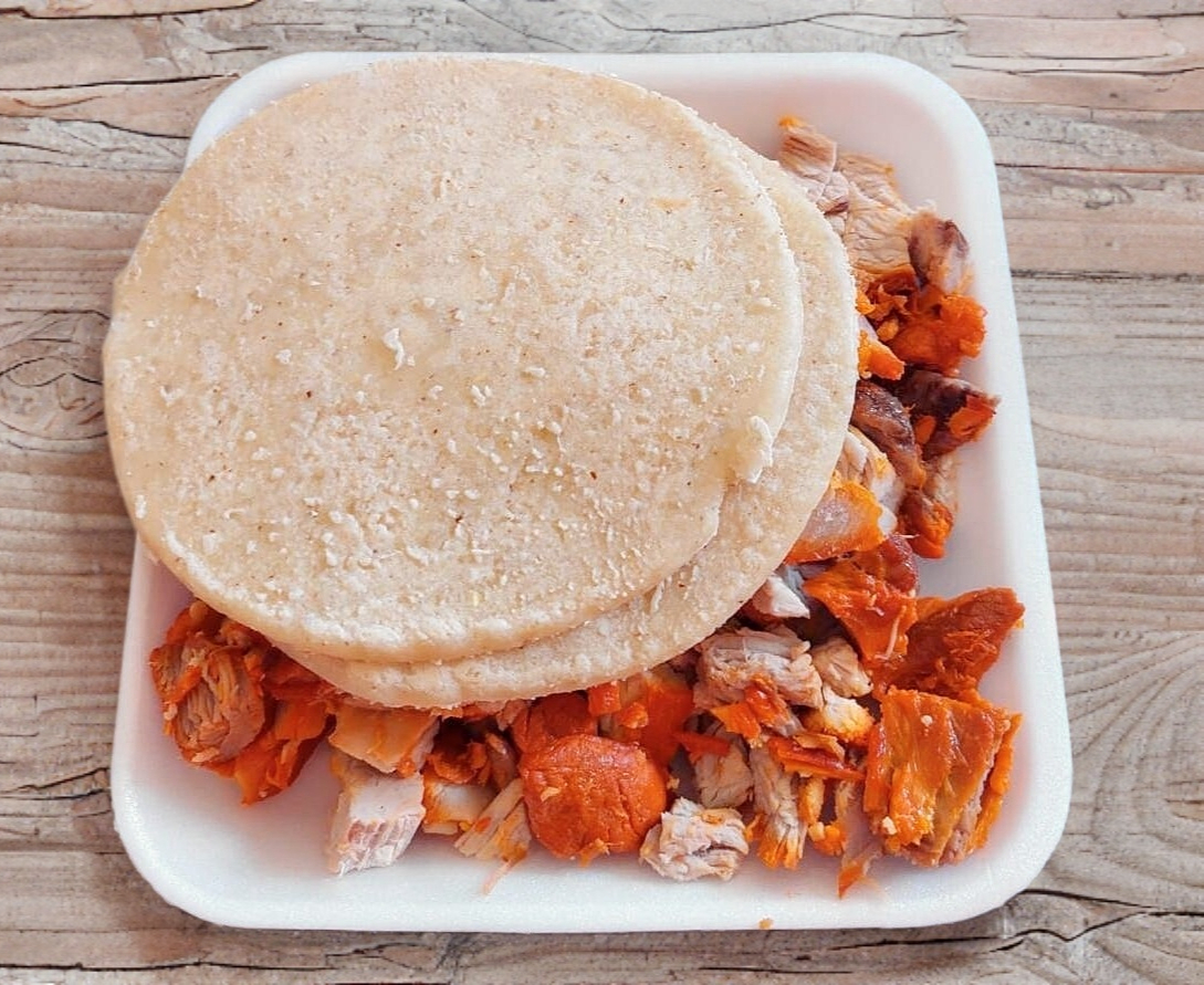1 kg de carnitas, 1 kg de tortillas de maíz y 1 refresco de 2 litros. Acompañado de salsa mexicana y salsa picante.