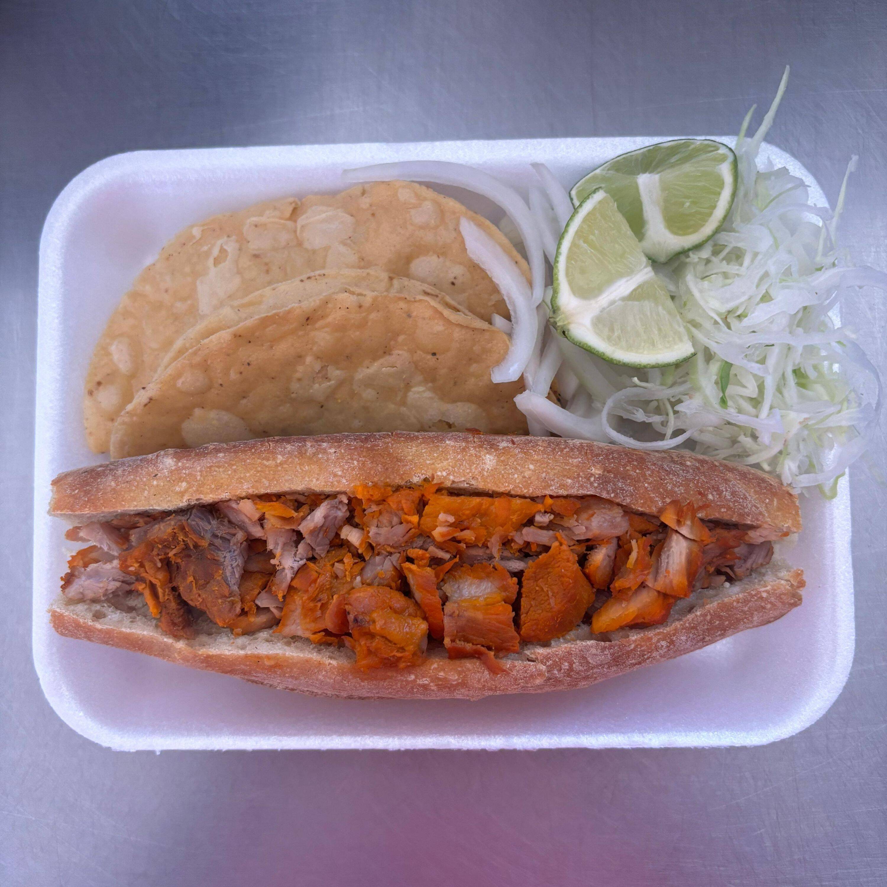 Torta ahogada de carnitas y 2 tacos dorados. Acompañada de salsa de jitomate, salsa picante, cebolla, col y limón.