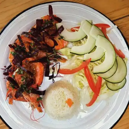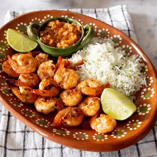Camarones preparados con salsa secreta especial de la casa, acompañados de arroz y ensalada.