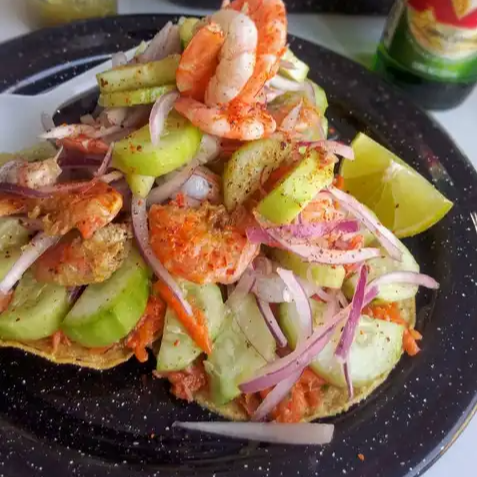 Tostada preparada con mezcla de mariscos frescos y salsas de la casa.