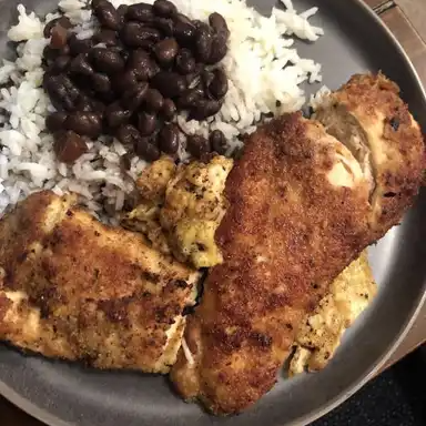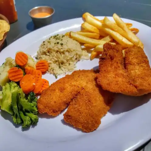 Filete de pescado tilapia empanizado y frito, acompañado de arroz y ensalada.