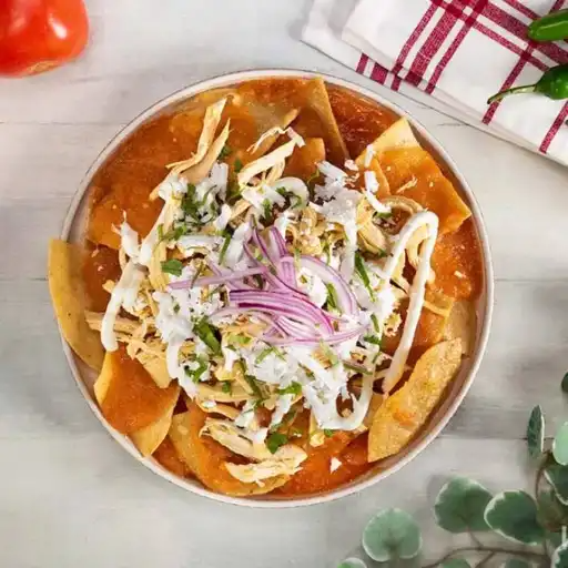 Totopos bañados en salsa a elegir, acompañados de pollo deshebrado, crema, queso y cebolla.