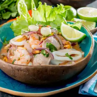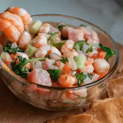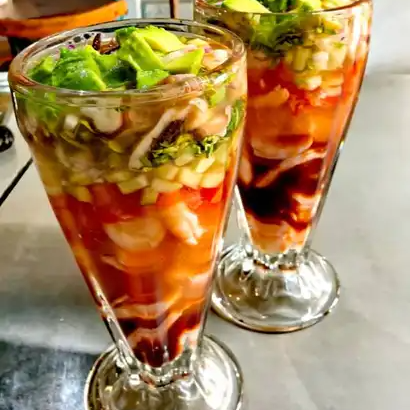 Ceviche preparado con pulpo, camarón cocido y camarón fresco, porción a elegir.