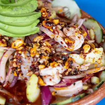 Aguachile preparado con salsa macha de chile de árbol y chiltepín, cacahuate y salsas de la casa, porción a elegir.