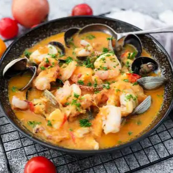 Sopa preparada con camarón, tilapia en trozos y pulpo con un consomé de camarón con toque casero y tradicional, con jitomate, cebolla y cilantro.