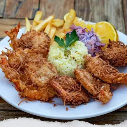 Camarones empanizados con coco rallado, acompañados de arroz y ensalada.