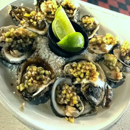 Ostiones servidos en su concha con limón y salsa de la casa, porción a elegir.