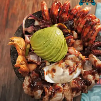 Molcajete preparado con pulpo, camarón cocido, camarón desnaturalizado, callo, ostión, camarón seco y salsas de la casa.