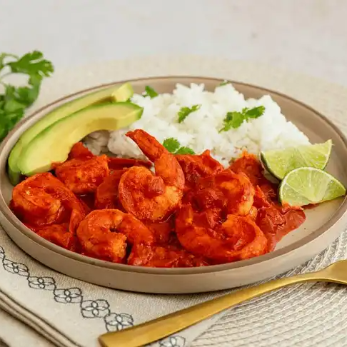 Camarones salteados en salsa de chile rojo, acompañados de arroz y ensalada.