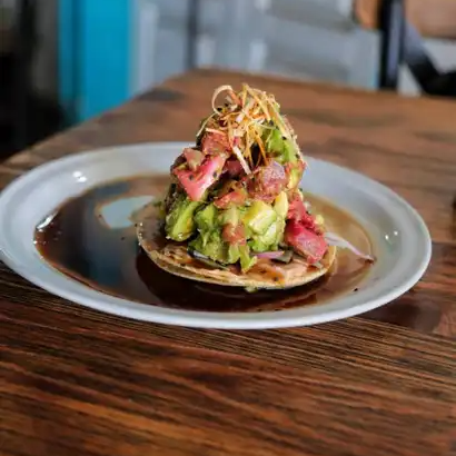 Disfruta de la fusión perfecta de sabores y texturas en nuestra tostada de atún fresco, acompañada de aguacate cremoso, aderezo chipotle, poro frito crujiente, ajonjolí tostado y una salsa oriental dulce que te hará sentir en el paraíso.