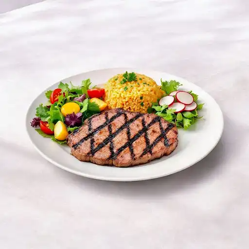 Arrachera asada, acompañada de guarnición a elegir y ensalada.