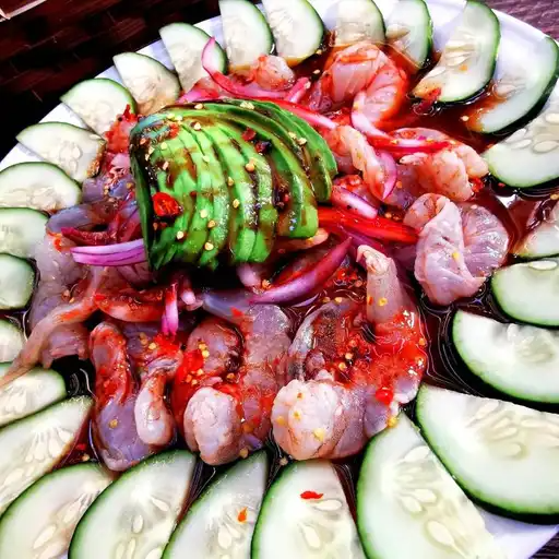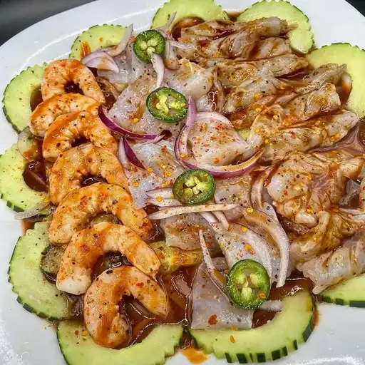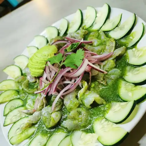 Aguachile preparado con camarón en salsa verde, porción a elegir.