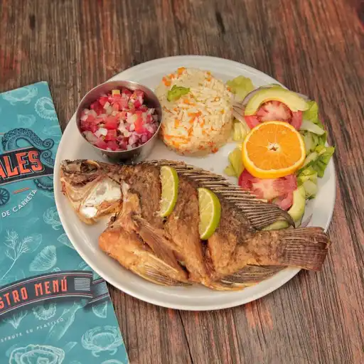 Filete de pescado tilapia preparado en mojo de ajo, acompañado de arroz y ensalada.