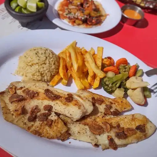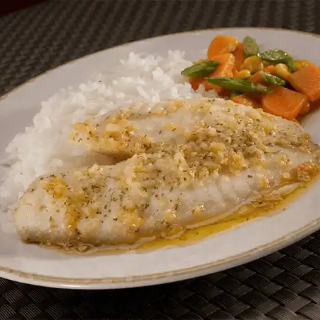 Filete de pescado tilapia salteado con ajo y mantequilla, acompañado de arroz y ensalada.