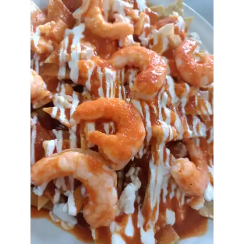Totopos bañados en salsa a elegir, acompañados con camarón salteado, frijoles, queso, crema y cebolla.