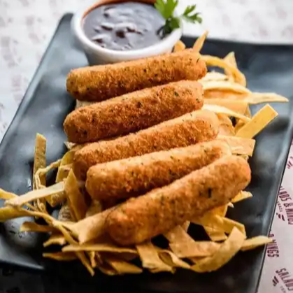 Orden de dedos de queso empanizados y fritos, acompañados con aderezo.