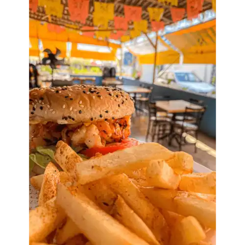 Hamburguesa de camarones paso ados y un toque de aderezo chipotle y queso blanco, lechuga y cebolla, acompañada de papas a la francesa crujientes que te dejará con ganas de más.