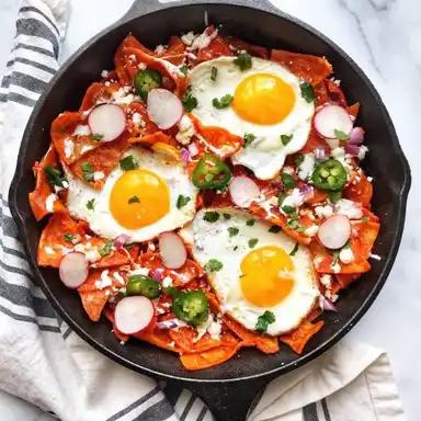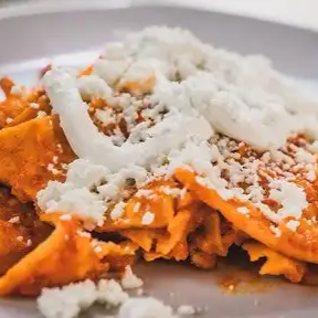 Totopos bañados en salsa a elegir, acompañados de huevo al gusto, crema, queso y cebolla.