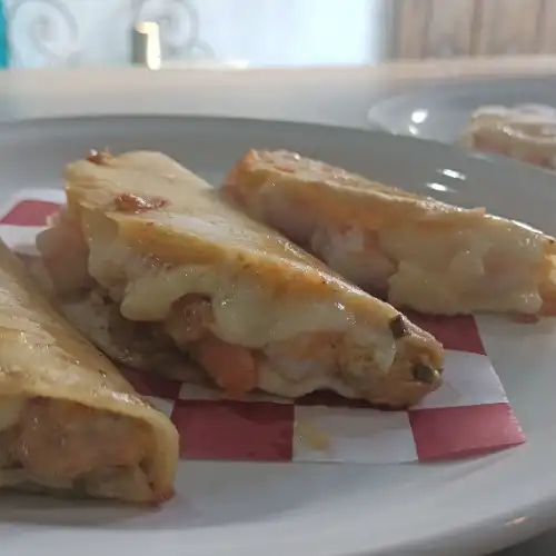 Tacos preparados con camarón guisado, queso derretido, vegetales salteados con aderezo, porción a elegir.