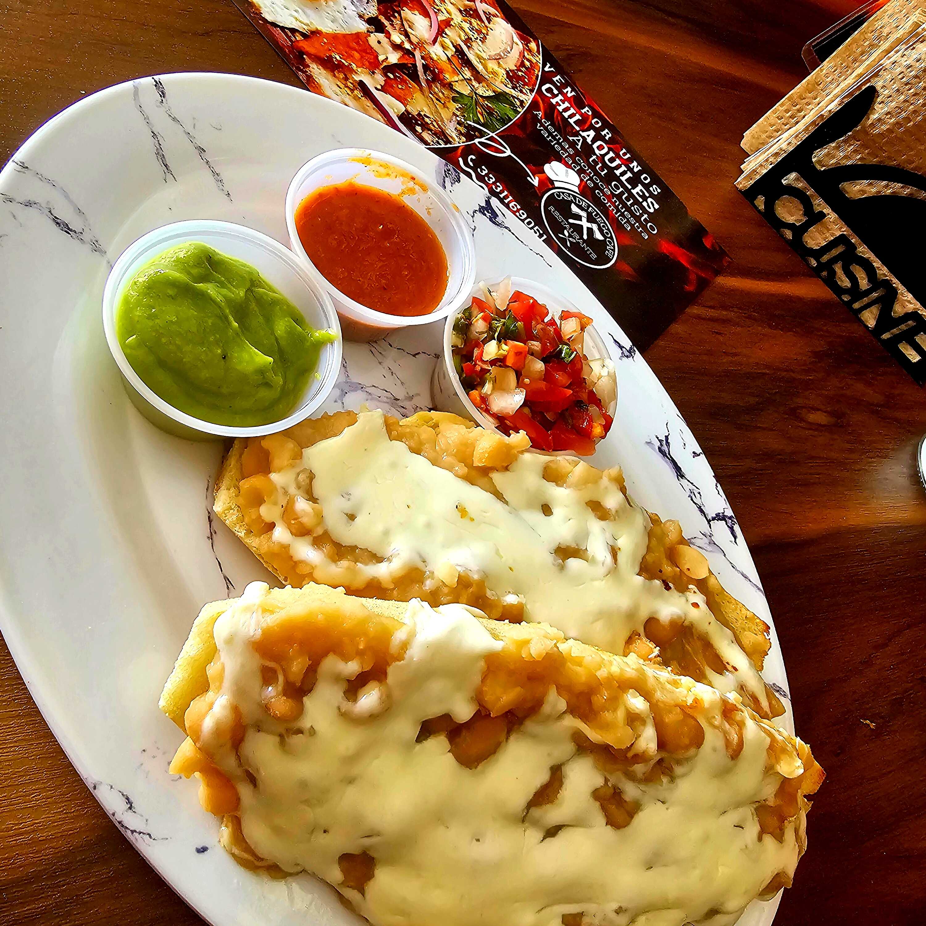 2pz. fiijoles fritos con queso gratinada acompañados de salsa mexicana y salsa picantes