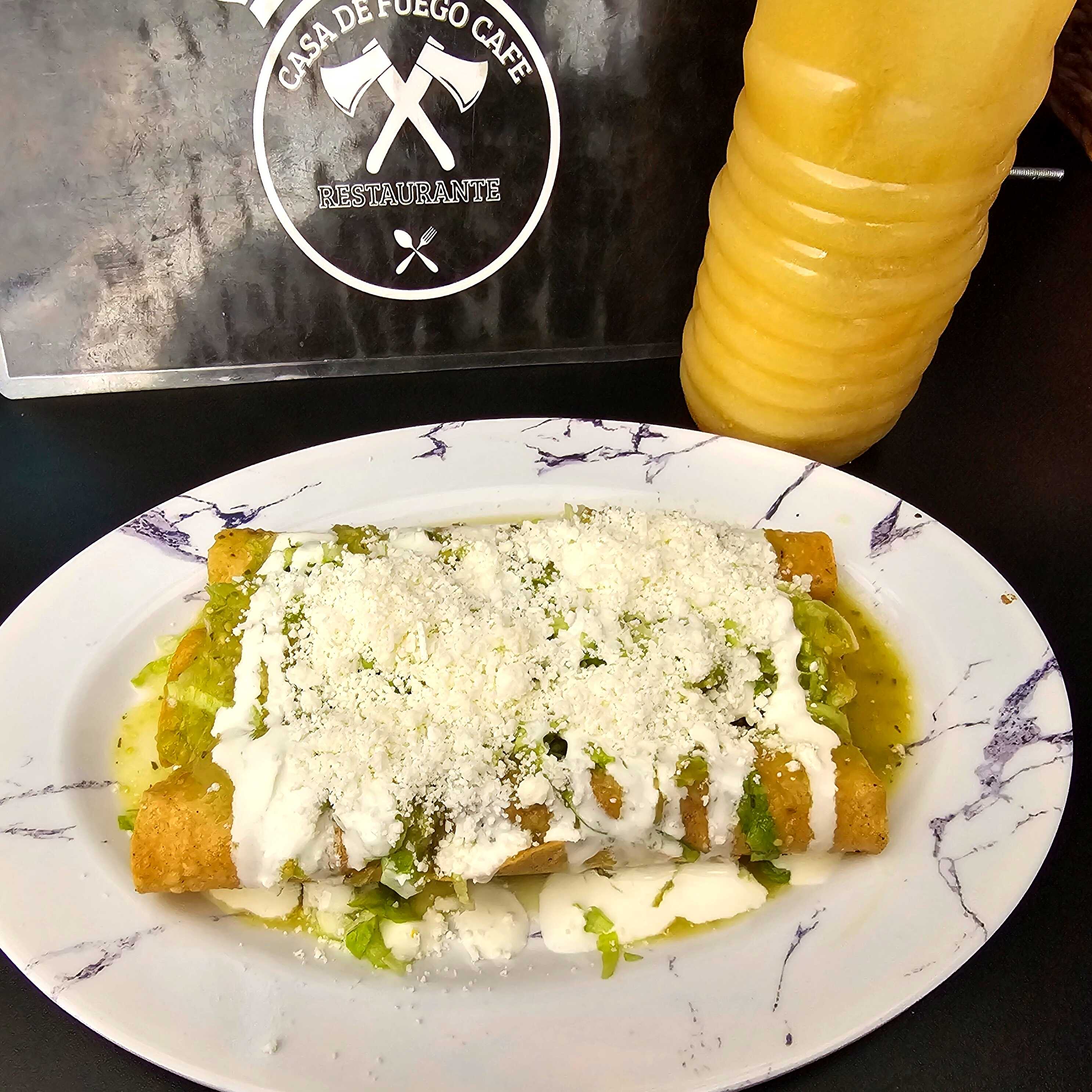 3pz. flutas de pollo con salsa verde,crema,queso 1.l de agua ò cafe de olla