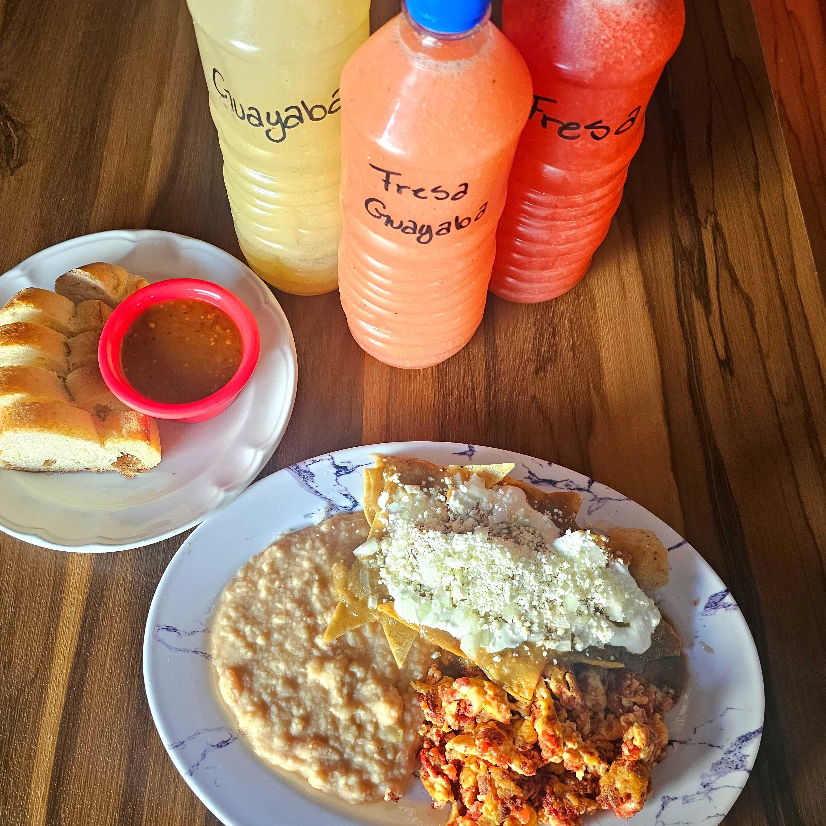 chilaquiles rojos o verdes, con frijoles, huevos revuelto 1.l de agua o cafe de olla