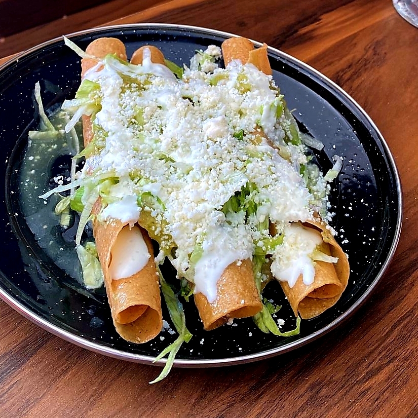 3pz. flautas de pollo acompañadas con lechuga, salsa verde, crema, queso