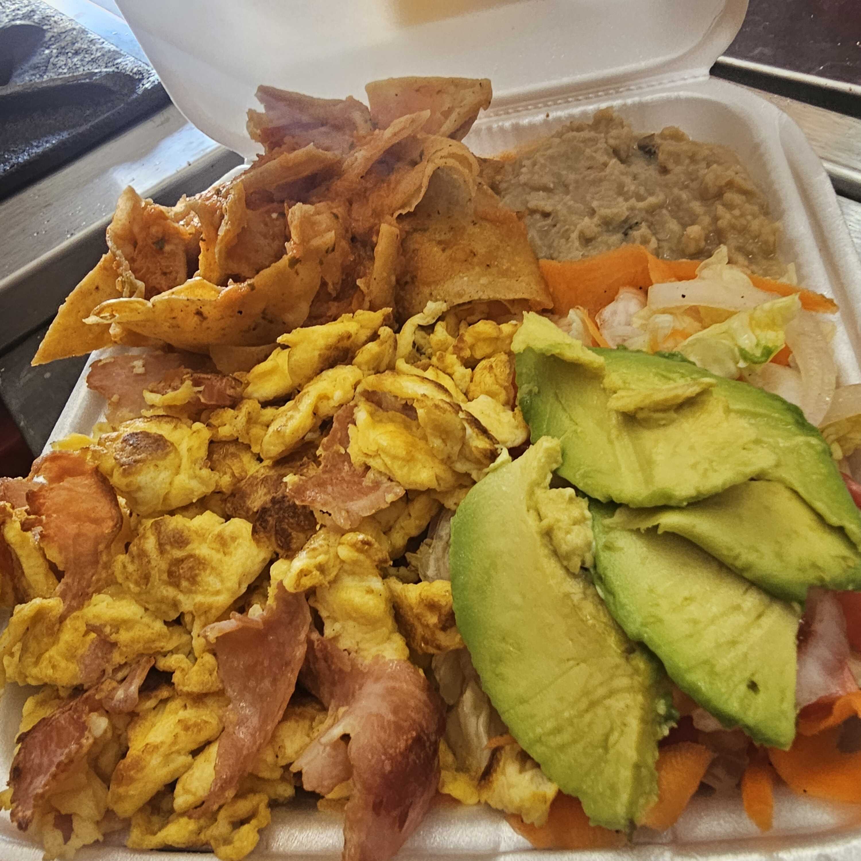 porcíon de chilaquiles rojos, porcíon de frijoles fritos, huevo con jamón, ensalada(lechuga,jitomate,zanahoria,aguacate)